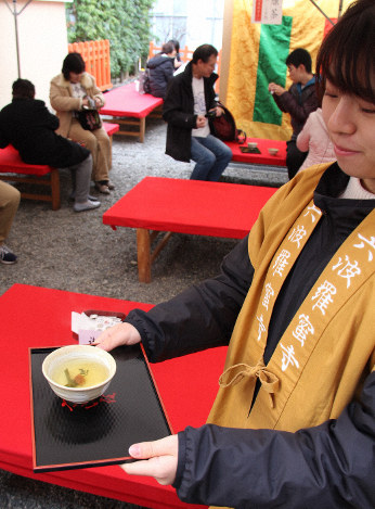 京都市東山区の六波羅蜜寺で、正月に飲む大福茶の起源とされる「皇服(おうぶく)茶」が3日まで振る舞われた。参拝者は、梅干しと結び昆布が入った茶を飲んで無病息災を願った。