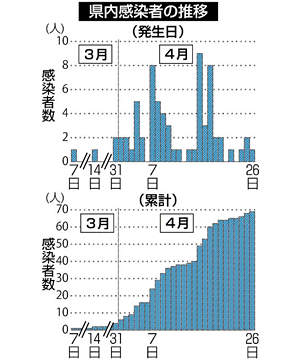 女性は夫の感染が確認されて以降、外出しておらず、夫からの二次感染とみられる。県は濃厚接触者の検査について「必要がある人には実施する」との方針で、無症状でも医療、福祉関係者や教職員など接触機会の多い職業の人について検査してきた。そのほかの人は検査をしていないケースがあったものの「健康観察期間が過ぎても不要不急の外出を避けるように呼び掛けている」と説明。健康観察の期間について「14日間だけではない。3週間みようとの場合もある」としている。