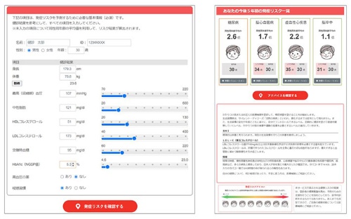 契約した健康保険組合の被保険者の年齢、性別、身長、体重、血圧、脂質、血糖値、喫煙習慣、運動習慣の有無といったデータを基に、糖尿病、心筋梗塞、脳卒中になるリスクが、同性・同年齢の平均値より何倍高いかを予測した結果を被保険者自身に通知する。