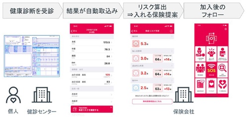 同社が8月にも開始しようとしているサービスは、個々人の健診データに基づいて疾患のリスクを予測すると共に、それに対してソリューションを持つ保険会社や食品会社、スポーツジムなどの健康支援企業へと誘導するものだ。