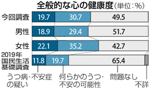 全般的な心の健康度では「何らかのうつ・不安を抱えている可能性がある人」は30.7%、「うつ病・不安症が疑われる人」は19.7%で、計50.4%。比較した厚生労働省の2019年国民生活基礎調査の31.5%から18.9ポイント悪化し、男性よりも女性の落ち込みが目立った。