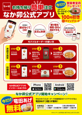 なか卯は、スマートフォン向け「なか卯公式アプリ」(iPhone版・Android版)で、持ち帰り専用の「モバイルオーダー」の提供を開始した。