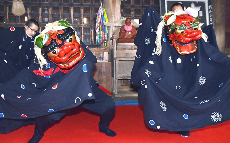 「全ての人の健康を願う」。午前9時、保存会名誉会長の重盛正さん(72)のあいさつに続き、口を閉じた雄獅子と口を開いた雌獅子が南北に分かれて舞を始めた。笛と太鼓の音に乗せ、悪魔をはらうように剣を動かす「剣(つるぎ)の舞」、御幣を振って豊作を祈る「豊穣の舞」など、息の合った五つの舞を奉納。15分間の儀式が終わると、厳かな雰囲気に包まれていた本堂に大きな拍手が鳴り響いた。