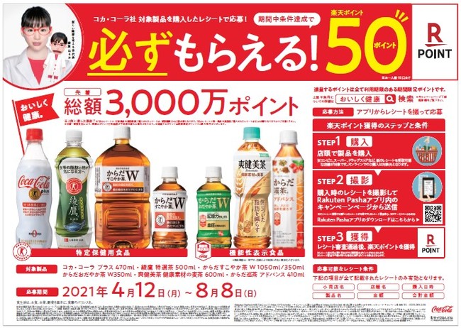 新しい生活様式によって、生活者のライフスタイルや価値観が変わり、健康意識が一層高まってきました。長く健康で元気でいるためには、ガマンすることばかりではなく、体に取り入れるものや運動などバランスが大事です。コカ・コーラ社の特定保健用食品および機能性表示食品である「コカ・コーラ プラス」、「綾鷹 特選茶」、「からだすこやか茶W」、「からだおだやか茶W」、「爽健美茶 健康素材の麦茶」、「からだ巡茶 アドバンス」という多彩なラインナップを通じて、コカ・コーラ社製品ならではの「おいしく健康」という価値を伝達していきます。また、対象製品をお買い上げいただき、条件を達成することで、どなたでも楽天ポイントが必ずもらえるキャンペーンを実施します。