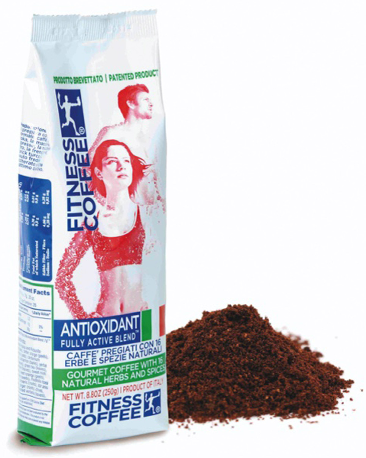 まずご紹介するのが、厳選した良質豆をはじめとする16種類のハーブやスパイスを配合した、その名もズバリ〈フィットネス・コーヒー〉。その豊富な含有成分は下図を見ていただくとして、特筆すべきは抗酸化物質、ポリフェノールの含有量だ。スウェーデンで行われた科学研究では、通常のコーヒーや赤ワインはもちろん、緑茶に至っては3倍もの抗酸化効果があると報告されている。この抗酸化物質は、活性酸素の生成を抑え、体内細胞の老化を防ぐ効果が期待できる。また運動する30分前に飲めば、運動中の集中力が上がり、脂肪吸収を抑えつつ脂肪燃焼の促進も期待できるそう。なるほど、これぞまさに“フィットネス”コーヒー!?