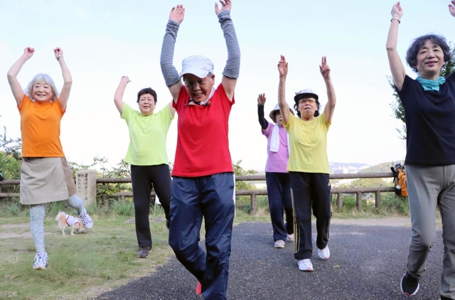 7月下旬の早朝。標高312メートル横尾山の麓に、60~80代の男女約20人が集まった。大きな輪になって「1・2・3」と声を合わせ、水平に広げた腕を回したり足を上げたりと、休む暇なく約40分間、気持ちのよい汗を流した。