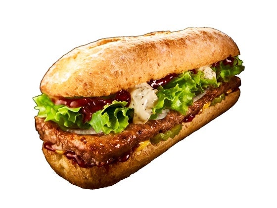 リブ(アバラ肉)に見立てたポークパティに、数種類ブレンドしたスパイスを効かせ、スモーキーな香りが本格的なBBQソースとアルゼンチン産はちみつを使用したハニーマスタードソースを合わせ、レタス、スライスオニオンなどとともに小麦の風味を感じる全粒粉入りのソフトフランスパンで挟んだ人気定番商品『リブサンド ポーク』に、粗挽き黒こしょうの風味とピリッとした辛味が癖になる黒こしょうマヨソースをトッピングしました。黒こしょうマヨソース、BBQソース、ハニーマスタードソースの組み合わせが食欲をそそる、食べ応え抜群の商品です。
