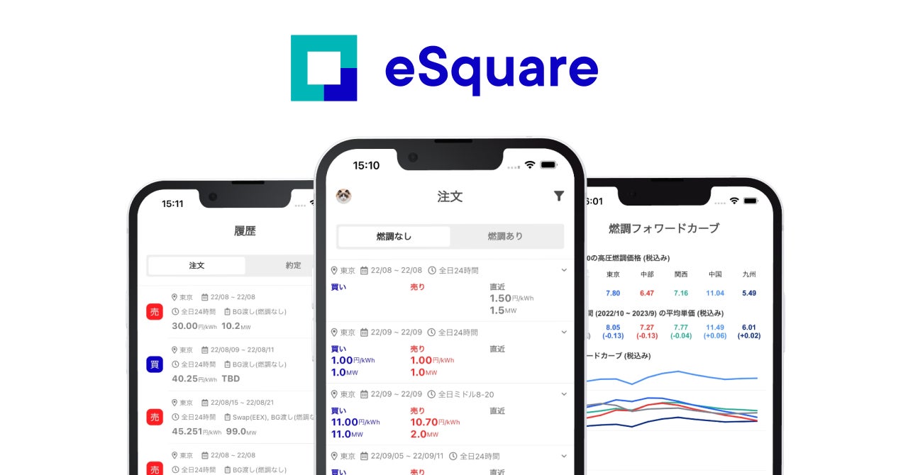 eSquareでは、発電事業者、電力小売事業者、トレーダーといった150社を超える企業からの注文や約定実績がリアルタイムに見える化されています。今回のモバイルアプリの提供により、利用企業は、移動中でも、パソコンを開かずとも、マーケット情報の確認や電力の売り買いが出来るようになります。