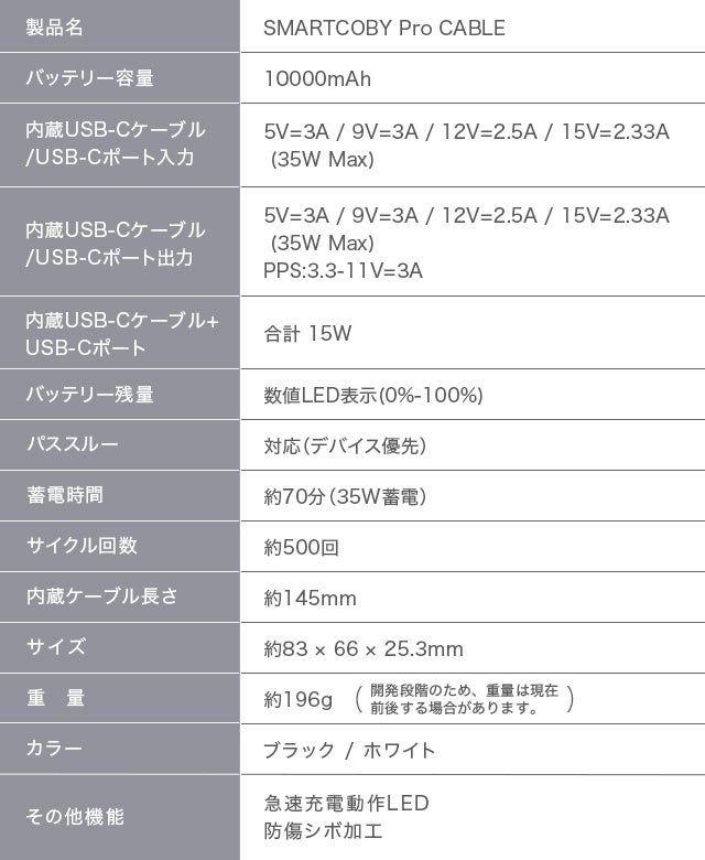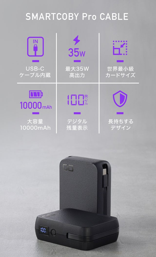 - ケーブル内蔵モバイルバッテリー『SMARTCOBY Pro CABLE』 プロジェクトページ(Makuake)