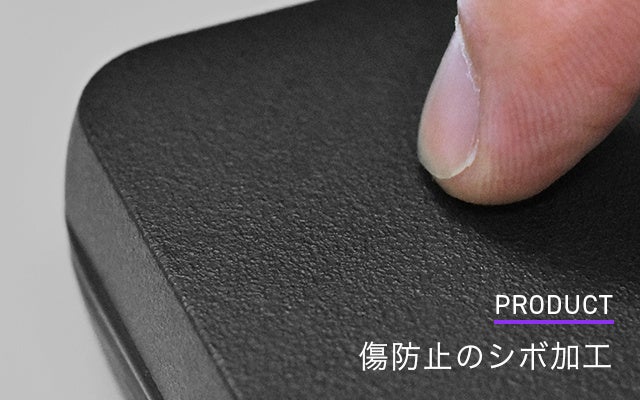 充電器本体の表面は一眼レフカメラのボディのような粗いシボ加工を施しているため、ペンや爪で引っ搔いたりしても製品表面に傷が付きにくいという一つの機能を付加しており、より多機能性を高めました。