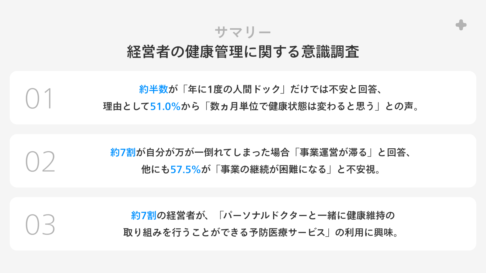 からの記事と詳細 ( 【経営者の健康管理の実態は?】約半数が「年に1度の人間ドックだけでは不安」と回答理由に「自分が倒れたら事業の継続が困難になる」などの声 - PR TIMES )