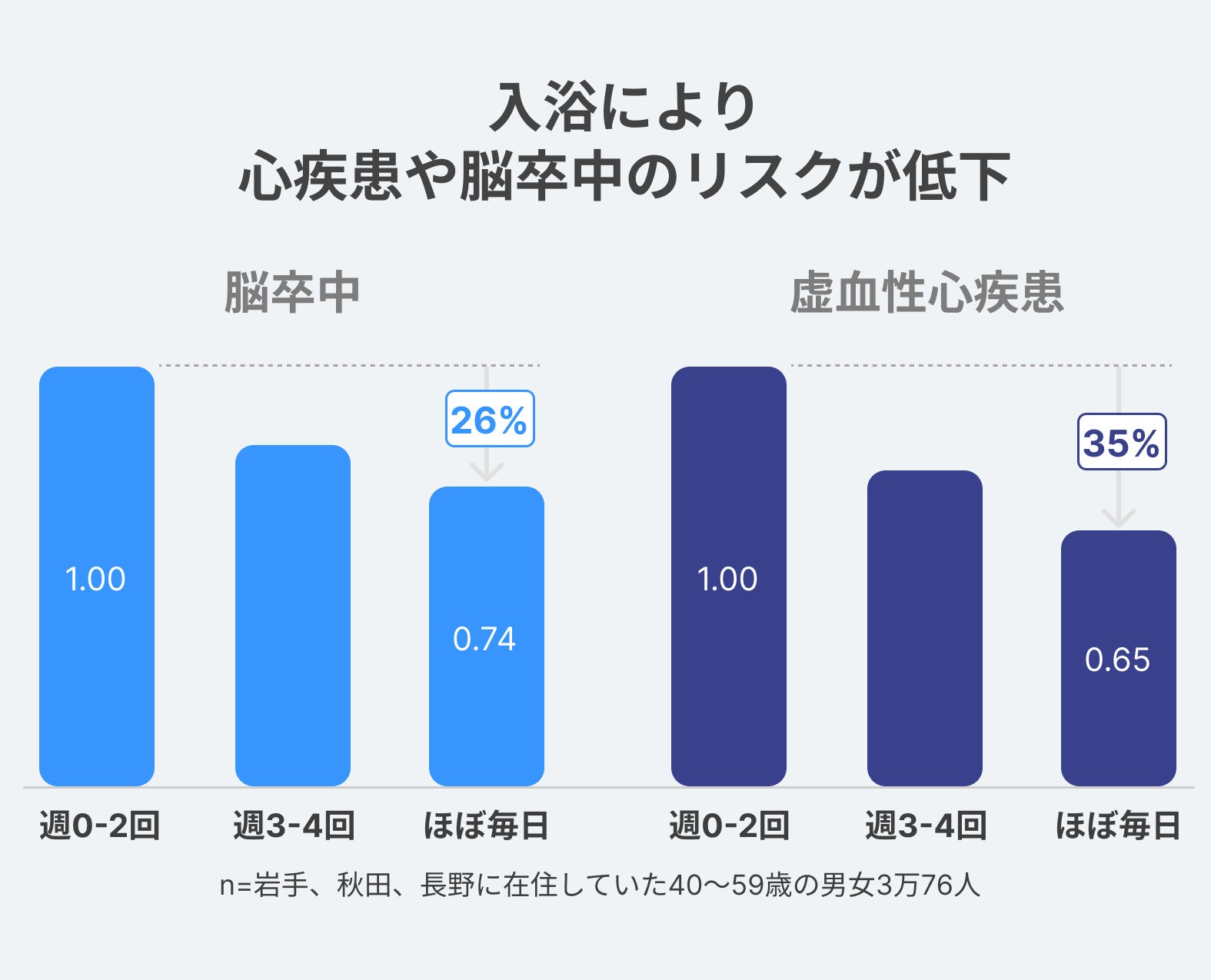 虚血性心疾患発症リスクが35%、脳卒中の発症リスクは26%低下しました。(*4) 別の研究では、毎日湯船に浸かって入浴する高齢者は、週2回以下の高齢者と比べ要介護認定のリスクが約3割減少したとする研究もあります。(*5)