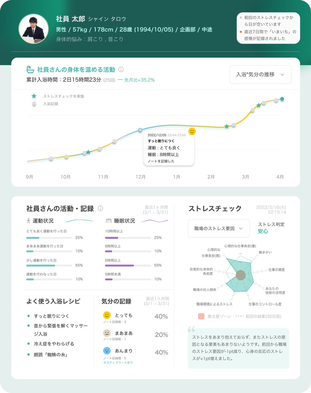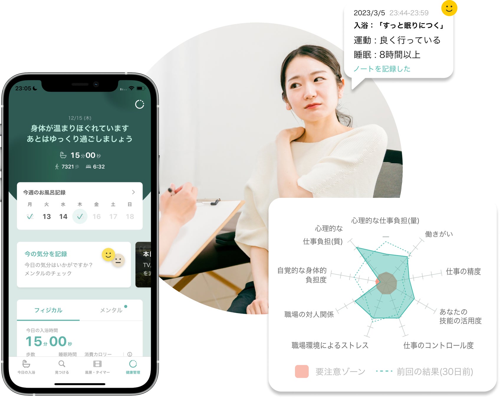 お風呂の達成度、グラフなどを確認しながら、身体を温める健康習慣を実践できる健康増進機能を提供。お風呂だけでなく、