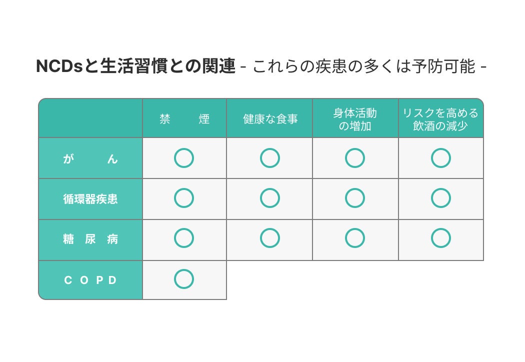 高齢化社会を迎える日本では、人々は健康を維持し生涯現役で活躍していくことが明るい日本社会へと繋がっていきます。高所得国の日本での健康維持においては心疾患や脳卒中などに対する非感染性疾患(NCD)への対策が重要です。生活習慣病を含む慢性疾患の発症や悪化は、個人の意識と行動だけでなく、取り巻く社会環境も大きく関わってきます。日常の習慣、関わる地域や職場など、環境要因を含めた幅広い視点から包括的に治療や改善を促していくことが世界的な潮流になっています。別の健康課題には若年層の自殺があります。20~30歳代の死因の第1位が自殺(平成29年-厚生労働省)であり近年、メンタルヘルスや睡眠といったテーマでも予防医療の重要性が増しています。(*1)