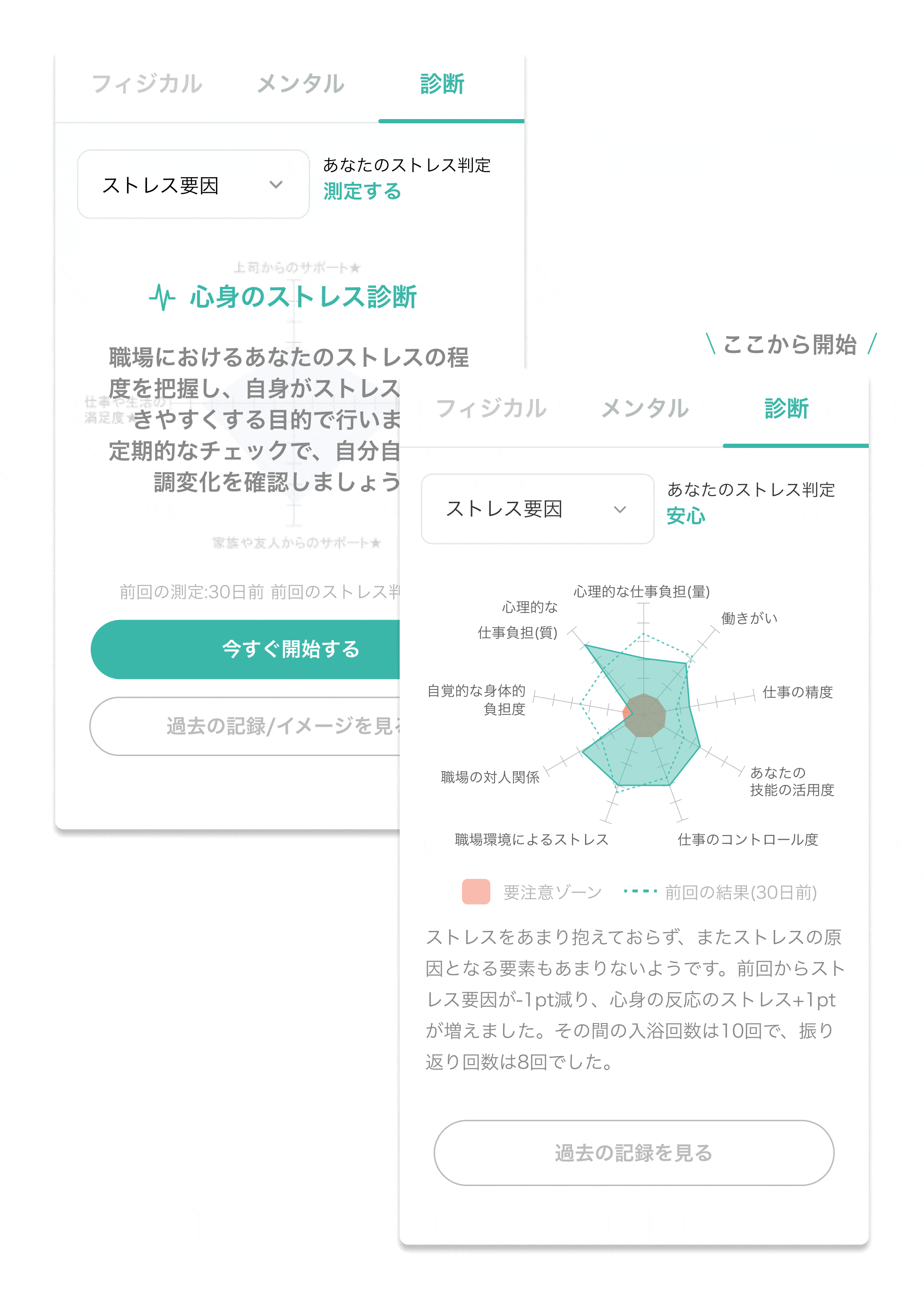 健康管理画面からは、自身の心と体のストレス状態をチェックできる