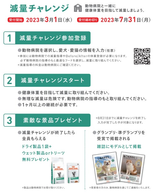 「健康体重キャンペーン」は、まずペットオーナーが愛犬・愛猫の健康体重を把握することから始め、減量が必要な場合には動物病院とペットオーナーが一緒に対策に取り組むチャレンジです。キャンペーンに参加しチャレンジを完了した全員にロイヤルカナンの製品をプレゼントするほか、特に優秀な結果を残したグランプリ・準グランプリの犬と猫には、モデルとしてプロカメラマン撮影による雑誌掲載の特典も用意するなど、愛犬・愛猫の健康的な長生きに欠かせない健康体重を楽しみながら意識し、実践いただけます。
