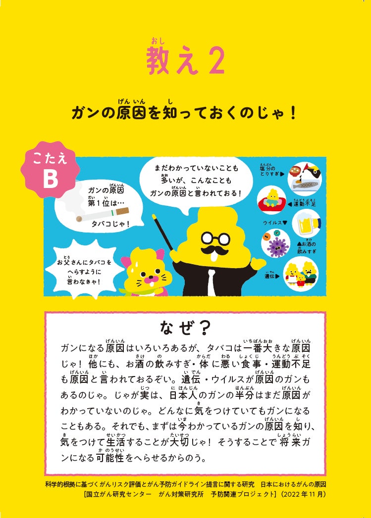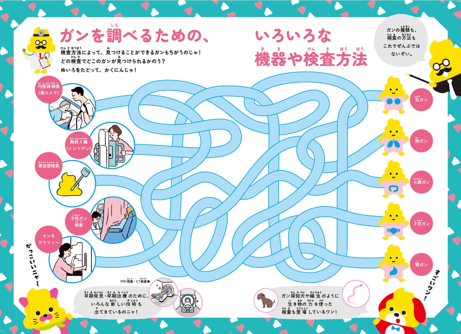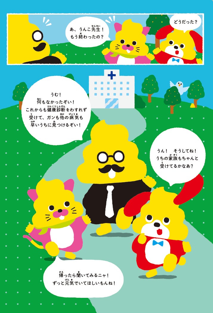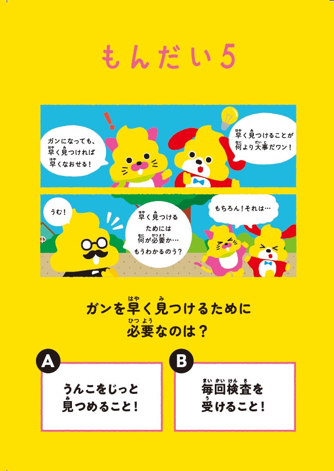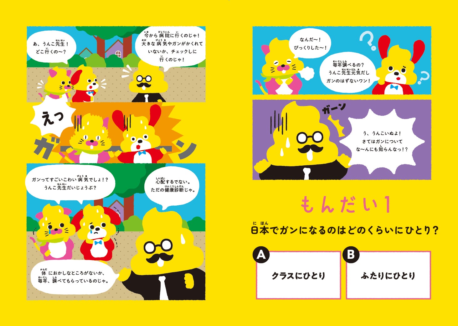 冊子の内容は二択クイズ形式で全5問。おなじみのうんこ先生が、がんのことをよく知らないうんこねこ、うんこいぬに健康診断を受けに行くことを告げる場面からはじまります。