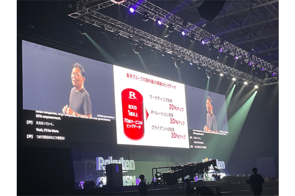 OpenAIとの協業で楽天は1億以上の楽天ID・70以上のサービスで得たビッグデータをOpenAIに提供。三木谷氏は「(AIの活用で)楽天グループ本体としては、マーケティング効率を20%、オペレーション効率を20%アップする。そして何よりも大切なことは、このAIの力を使って皆さんをエンパワーメントする」とした。「ユーザー、小さな会社、大きな会社、あるいは国、地方公共団体をエンパワーメントし、『国全体の効率を20%上げる』という大まかな目標を設定し、臨んでいきたい」と話し、楽天グループだけでなく、日本の社会全体を巻き込む大きな構想であることを明らかにした。
